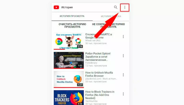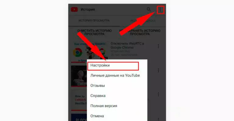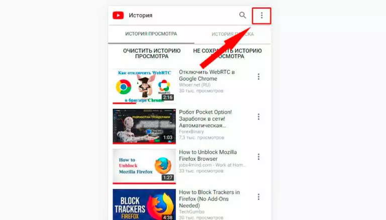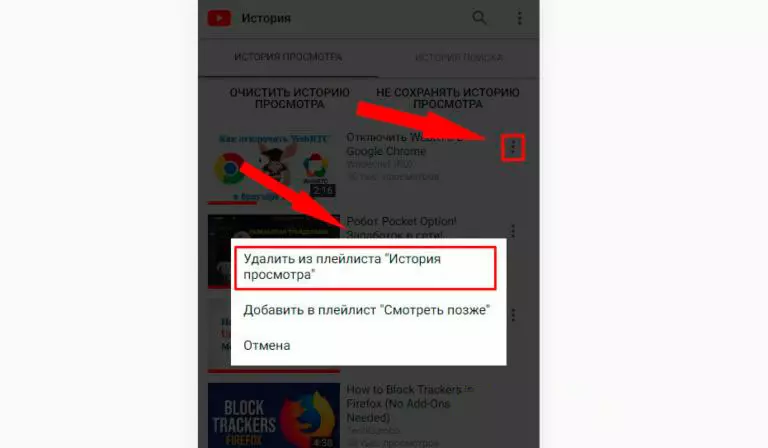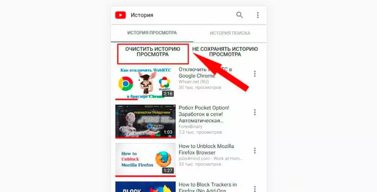 Удаление истории просмотра и поиска в YouTube на смартфоне