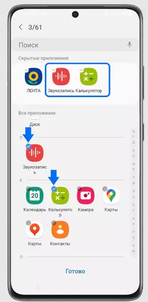 В новом окне будут представлены все приложения смартфона. На соответствующих иконках появятся галочки, а сами программы будут добавлены в список скрытых.